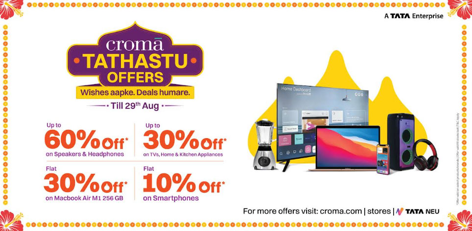 ટાટા ગ્રુપની ભારતની સૌથી અગ્રણી ઓમ્ની-ચેનલ ઇલેક્ટ્રોનિક્સ રિટેલર ક્રોમા સ્પેશિયલ ગણેશ ચતુર્થી ઓફર્સ સાથે આ ઓગસ્ટમાં રોમાંચ વધારી રહી છે. સમગ્ર મહારાષ્ટ્ર, ગુજરાત, કર્ણાટક, આંધ્ર પ્રદેશ, તેલંગાણા, મધ્ય પ્રદેશ, તમિળનાડુ અને ગોવામાં 22થી 29 ઓગસ્ટ સુધી આ ઓફર ચાલશે. ગ્રાહકો સ્ટોરમાં જઈને અથવા croma.com પરથી ખરીદી કરી શકે છે. ઇન્સ્ટન્ટ બેંક કાર્ડ ડિસ્કાઉન્ટ્સ વધુ સારી બચત કરાવે છે.તહેવારો પર રજૂ કરાયેલી આ શ્રેણી પાર્ટી ઓડિયોથી માંડીને રોજબરોજની રસોડાની વસ્તુઓ સુધી તમામ કેટેગરીઝમાં આકર્ષક ડીલ્સ પૂરી પાડે છે. ગ્રાહકો રિયલમી ટીડબ્લ્યુએસ રૂ. 999માં, રૂ. 2,999થી શરૂ થતા માઇક સાથેના પાર્ટી સ્પીકર્સ અને રૂ. 15,990માં વાયરલેસ યુએચએફ માઇક સાથે ક્રોમાના 200 વોટ પાર્ટી સ્પીકરમાંથી પસંદગી કરી શકે છે. સોની, જેબીએલ અને માર્શલના પ્રીમિયમ હેડફોન્સ પર એક્સક્લુઝિવ કિંમતો આ રોમાંચને વધારે છે. ગ્રાહકો અગ્રણી વેલ્યુ 5જી સ્માર્ટફોન્સ* પર આકર્ષક ઓફર્સ પણ મેળવશે.આ ખરીદીને વધુ કિફાયતી બનાવવા માટે ક્રોમા લોકપ્રિય સમયગાળા પર સરળ ઇએમઆઈ ઓફર કરી રહ્યું છે. ગ્રાહકો ટોચની કેટેગરીઝ પર એક્સચેન્જ બોનસનો લાભ પણ લઈ શકે છે. ઊંચા બિલની રકમો પર બેંકની બચતમાં વધારો પણ થશે.