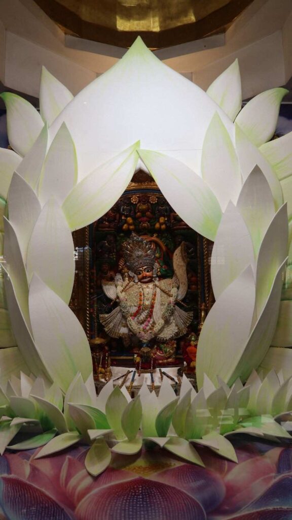 સાળંગપુર ધામમાં શરદોત્સવ નિમિત્તે શ્રી કષ્ટભંજનદેવ હનુમાનજી દાદાને હીરા જડિત મુકુટ અને દિવ્ય વાઘા ધરાવીને કમળની સુંદર થીમનો અદ્ભુત શણગાર કરવામાં આવ્યો